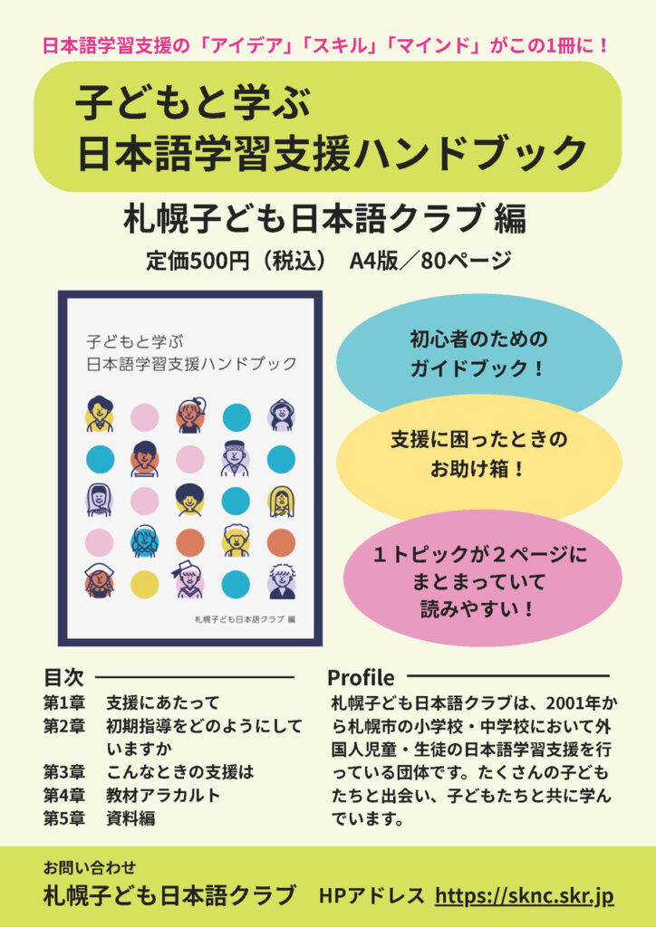 「子どもと学ぶ日本語学習支援ハンドブック」 投稿公開日:2025-09-23 投稿カテゴリー:notice この度、札幌子ども日本語クラブで「子どもと学ぶ日本語学習支援ハンドブック」を制作いたしました。ご希望の方は、下記フォームよりご連絡をお願いいたします。 お問い合わせはこちら